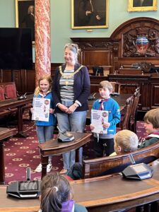 The treasure was part-edible (flap jacks!)  and part-experience – a chance to sit in the Council Chamber at the Guildhall and meet the Mayor of Bath!  She kindly answered the young people’s questions (and no, she doesn’t lock the Mayoral Chain of Office up in a glass box at night or wear it to bed!) she very presented two of our Beavers with their Bronze Scout Badges.  Well done Connie and Joe.